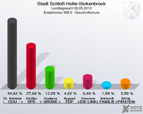 Stadt Schloß Holte-Stukenbrock, Landtagswahl 09.05.2010, Erststimmen WB 5 - Grauthoffschule: Dr. Brinkmeier CDU: 44,62 %. Gürtler SPD: 27,69 %. Greitens GRÜNE: 12,05 %. Ruppel FDP: 4,02 %. Granzow DIE LINKE: 6,46 %. Brinkrolf FAMILIE: 1,58 %. Böhle PIRATEN: 3,59 %. http://www.votemanager.de