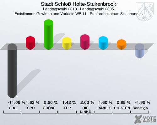Stadt Schloß Holte-Stukenbrock, Landtagswahl 2010 - Landtagswahl 2005, Erststimmen Gewinne und Verluste WB 11 - Seniorencentrum St. Johannes: CDU: -11,09 %. SPD: 1,62 %. GRÜNE: 5,50 %. FDP: 1,42 %. DIE LINKE: 2,03 %. FAMILIE: 1,60 %. PIRATEN: 0,89 %. Sonstige: -1,95 %. http://www.votemanager.de