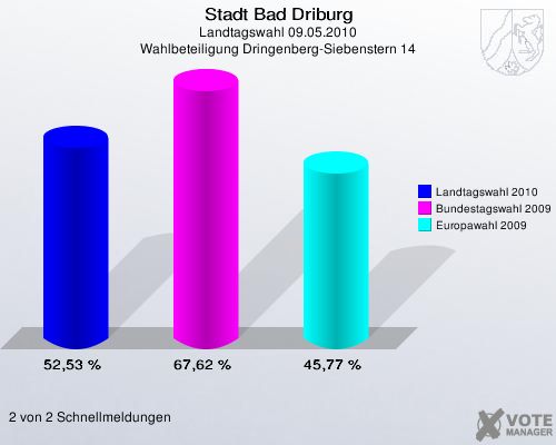Stadt Bad Driburg, Landtagswahl 09.05.2010, Wahlbeteiligung Dringenberg-Siebenstern 14: Landtagswahl 2010: 52,53 %. Bundestagswahl 2009: 67,62 %. Europawahl 2009: 45,77 %. 2 von 2 Schnellmeldungen http://www.votemanager.de