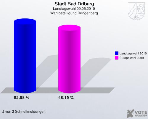 Stadt Bad Driburg, Landtagswahl 09.05.2010, Wahlbeteiligung Dringenberg: Landtagswahl 2010: 52,98 %. Europawahl 2009: 48,15 %. 2 von 2 Schnellmeldungen http://www.votemanager.de