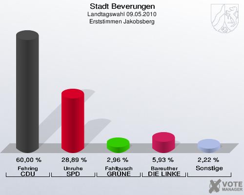 Stadt Beverungen, Landtagswahl 09.05.2010, Erststimmen Jakobsberg: Fehring CDU: 60,00 %. Unruhe SPD: 28,89 %. Fahlbusch GRÜNE: 2,96 %. Bareuther DIE LINKE: 5,93 %. Sonstige: 2,22 %. http://www.votemanager.de