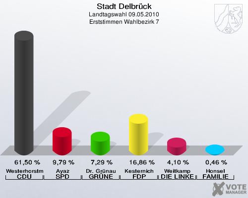 Stadt Delbrück, Landtagswahl 09.05.2010, Erststimmen Wahlbezirk 7: Westerhorstmann CDU: 61,50 %. Ayaz SPD: 9,79 %. Dr. Grünau GRÜNE: 7,29 %. Kesternich FDP: 16,86 %. Weitkamp DIE LINKE: 4,10 %. Honsel FAMILIE: 0,46 %. http://www.votemanager.de
