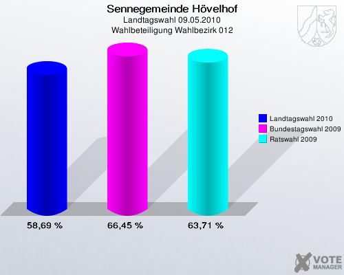 Sennegemeinde Hövelhof, Landtagswahl 09.05.2010, Wahlbeteiligung Wahlbezirk 012: Landtagswahl 2010: 58,69 %. Bundestagswahl 2009: 66,45 %. Ratswahl 2009: 63,71 %. http://www.votemanager.de