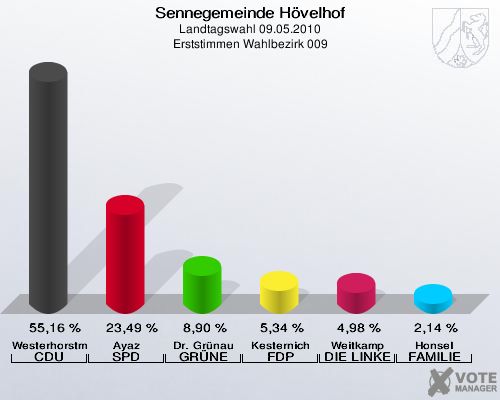 Sennegemeinde Hövelhof, Landtagswahl 09.05.2010, Erststimmen Wahlbezirk 009: Westerhorstmann CDU: 55,16 %. Ayaz SPD: 23,49 %. Dr. Grünau GRÜNE: 8,90 %. Kesternich FDP: 5,34 %. Weitkamp DIE LINKE: 4,98 %. Honsel FAMILIE: 2,14 %. http://www.votemanager.de