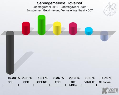 Sennegemeinde Hövelhof, Landtagswahl 2010 - Landtagswahl 2005, Erststimmen Gewinne und Verluste Wahlbezirk 007: CDU: -10,39 %. SPD: 2,33 %. GRÜNE: 4,21 %. FDP: 2,36 %. DIE LINKE: 2,19 %. FAMILIE: 0,89 %. Sonstige: -1,59 %. http://www.votemanager.de