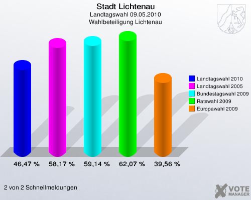 Stadt Lichtenau, Landtagswahl 09.05.2010, Wahlbeteiligung Lichtenau: Landtagswahl 2010: 46,47 %. Landtagswahl 2005: 58,17 %. Bundestagswahl 2009: 59,14 %. Ratswahl 2009: 62,07 %. Europawahl 2009: 39,56 %. 2 von 2 Schnellmeldungen http://www.votemanager.de
