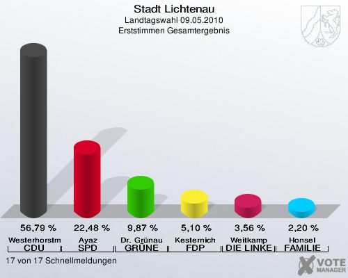 Stadt Lichtenau, Landtagswahl 09.05.2010, Erststimmen Gesamtergebnis: Westerhorstmann CDU: 56,79 %. Ayaz SPD: 22,48 %. Dr. Grünau GRÜNE: 9,87 %. Kesternich FDP: 5,10 %. Weitkamp DIE LINKE: 3,56 %. Honsel FAMILIE: 2,20 %. 17 von 17 Schnellmeldungen http://www.votemanager.de