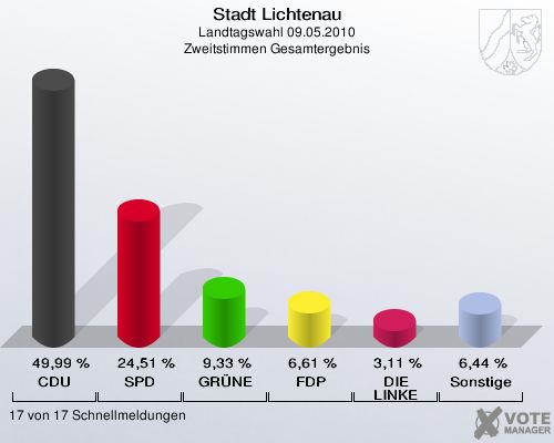 Stadt Lichtenau, Landtagswahl 09.05.2010, Zweitstimmen Gesamtergebnis: CDU: 49,99 %. SPD: 24,51 %. GRÜNE: 9,33 %. FDP: 6,61 %. DIE LINKE: 3,11 %. Sonstige: 6,44 %. 17 von 17 Schnellmeldungen http://www.votemanager.de