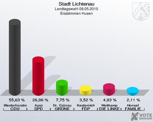 Stadt Lichtenau, Landtagswahl 09.05.2010, Erststimmen Husen: Westerhorstmann CDU: 55,63 %. Ayaz SPD: 26,06 %. Dr. Grünau GRÜNE: 7,75 %. Kesternich FDP: 3,52 %. Weitkamp DIE LINKE: 4,93 %. Honsel FAMILIE: 2,11 %. http://www.votemanager.de