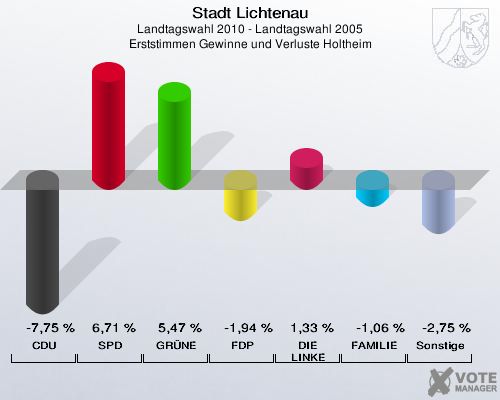 Stadt Lichtenau, Landtagswahl 2010 - Landtagswahl 2005, Erststimmen Gewinne und Verluste Holtheim: CDU: -7,75 %. SPD: 6,71 %. GRÜNE: 5,47 %. FDP: -1,94 %. DIE LINKE: 1,33 %. FAMILIE: -1,06 %. Sonstige: -2,75 %. http://www.votemanager.de