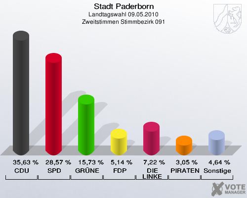 Stadt Paderborn, Landtagswahl 09.05.2010, Zweitstimmen Stimmbezirk 091: CDU: 35,63 %. SPD: 28,57 %. GRÜNE: 15,73 %. FDP: 5,14 %. DIE LINKE: 7,22 %. PIRATEN: 3,05 %. Sonstige: 4,64 %. http://www.votemanager.de