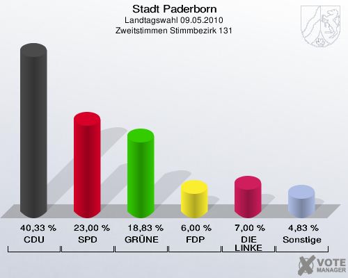 Stadt Paderborn, Landtagswahl 09.05.2010, Zweitstimmen Stimmbezirk 131: CDU: 40,33 %. SPD: 23,00 %. GRÜNE: 18,83 %. FDP: 6,00 %. DIE LINKE: 7,00 %. Sonstige: 4,83 %. http://www.votemanager.de