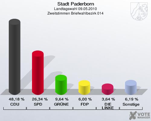 Stadt Paderborn, Landtagswahl 09.05.2010, Zweitstimmen Briefwahlbezirk 014: CDU: 48,18 %. SPD: 26,34 %. GRÜNE: 9,64 %. FDP: 6,00 %. DIE LINKE: 3,64 %. Sonstige: 6,19 %. http://www.votemanager.de