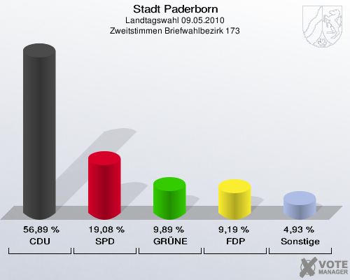Stadt Paderborn, Landtagswahl 09.05.2010, Zweitstimmen Briefwahlbezirk 173: CDU: 56,89 %. SPD: 19,08 %. GRÜNE: 9,89 %. FDP: 9,19 %. Sonstige: 4,93 %. http://www.votemanager.de