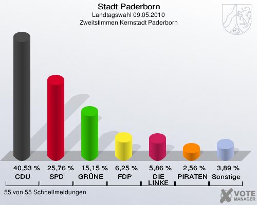 Stadt Paderborn, Landtagswahl 09.05.2010, Zweitstimmen Kernstadt Paderborn: CDU: 40,53 %. SPD: 25,76 %. GRÜNE: 15,15 %. FDP: 6,25 %. DIE LINKE: 5,86 %. PIRATEN: 2,56 %. Sonstige: 3,89 %. 55 von 55 Schnellmeldungen http://www.votemanager.de