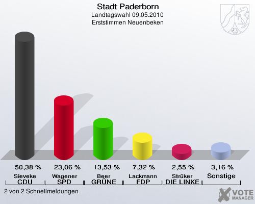 Stadt Paderborn, Landtagswahl 09.05.2010, Erststimmen Neuenbeken: Sieveke CDU: 50,38 %. Wagener SPD: 23,06 %. Beer GRÜNE: 13,53 %. Lackmann FDP: 7,32 %. Strüker DIE LINKE: 2,55 %. Sonstige: 3,16 %. 2 von 2 Schnellmeldungen http://www.votemanager.de
