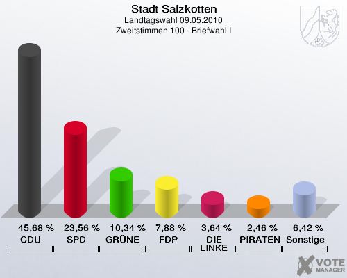 Stadt Salzkotten, Landtagswahl 09.05.2010, Zweitstimmen 100 - Briefwahl I: CDU: 45,68 %. SPD: 23,56 %. GRÜNE: 10,34 %. FDP: 7,88 %. DIE LINKE: 3,64 %. PIRATEN: 2,46 %. Sonstige: 6,42 %. http://www.votemanager.de