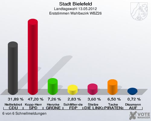 Stadt Bielefeld, Landtagswahl 13.05.2012, Erststimmen Wahlbezirk WBZ26: Nettelstroth CDU: 31,89 %. Kopp-Herr SPD: 47,20 %. Hennke GRÜNE: 7,26 %. Schlifter-de la Fontaine FDP: 2,83 %. Stelze DIE LINKE: 3,60 %. Tacke PIRATEN: 6,50 %. Dissmann AUF: 0,72 %. 6 von 6 Schnellmeldungen http://www.votemanager.de