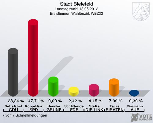 Stadt Bielefeld, Landtagswahl 13.05.2012, Erststimmen Wahlbezirk WBZ33: Nettelstroth CDU: 28,24 %. Kopp-Herr SPD: 47,71 %. Hennke GRÜNE: 9,09 %. Schlifter-de la Fontaine FDP: 2,42 %. Stelze DIE LINKE: 4,15 %. Tacke PIRATEN: 7,99 %. Dissmann AUF: 0,39 %. 7 von 7 Schnellmeldungen http://www.votemanager.de