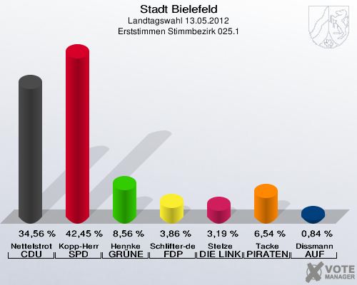Stadt Bielefeld, Landtagswahl 13.05.2012, Erststimmen Stimmbezirk 025.1: Nettelstroth CDU: 34,56 %. Kopp-Herr SPD: 42,45 %. Hennke GRÜNE: 8,56 %. Schlifter-de la Fontaine FDP: 3,86 %. Stelze DIE LINKE: 3,19 %. Tacke PIRATEN: 6,54 %. Dissmann AUF: 0,84 %. http://www.votemanager.de