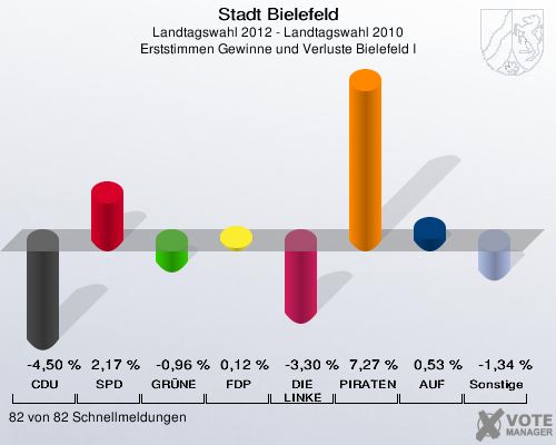 Stadt Bielefeld, Landtagswahl 2012 - Landtagswahl 2010, Erststimmen Gewinne und Verluste Bielefeld I: CDU: -4,50 %. SPD: 2,17 %. GRÜNE: -0,96 %. FDP: 0,12 %. DIE LINKE: -3,30 %. PIRATEN: 7,27 %. AUF: 0,53 %. Sonstige: -1,34 %. 82 von 82 Schnellmeldungen http://www.votemanager.de