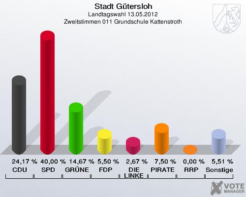 Stadt Gütersloh, Landtagswahl 13.05.2012, Zweitstimmen 011 Grundschule Kattenstroth: CDU: 24,17 %. SPD: 40,00 %. GRÜNE: 14,67 %. FDP: 5,50 %. DIE LINKE: 2,67 %. PIRATEN: 7,50 %. RRP: 0,00 %. Sonstige: 5,51 %. http://www.votemanager.de