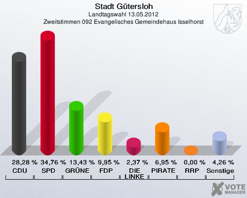 Stadt Gütersloh, Landtagswahl 13.05.2012, Zweitstimmen 092 Evangelisches Gemeindehaus Isselhorst: CDU: 28,28 %. SPD: 34,76 %. GRÜNE: 13,43 %. FDP: 9,95 %. DIE LINKE: 2,37 %. PIRATEN: 6,95 %. RRP: 0,00 %. Sonstige: 4,26 %. http://www.votemanager.de