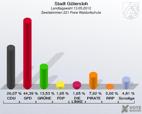 Stadt Gütersloh, Landtagswahl 13.05.2012, Zweitstimmen 221 Freie Waldorfschule: CDU: 26,07 %. SPD: 44,39 %. GRÜNE: 13,53 %. FDP: 1,65 %. DIE LINKE: 1,65 %. PIRATEN: 7,92 %. RRP: 0,00 %. Sonstige: 4,81 %. http://www.votemanager.de