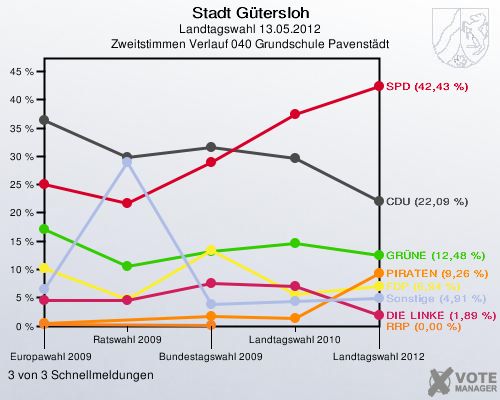Stadt Gütersloh, Landtagswahl 13.05.2012, Zweitstimmen Verlauf 040 Grundschule Pavenstädt: 3 von 3 Schnellmeldungen http://www.votemanager.de