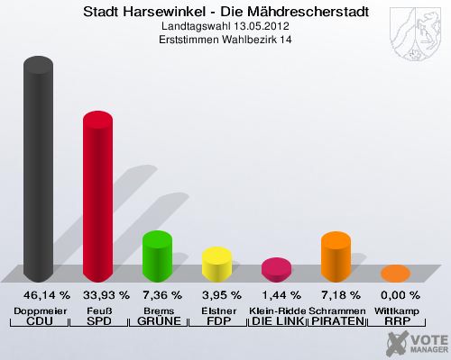 Stadt Harsewinkel - Die Mähdrescherstadt, Landtagswahl 13.05.2012, Erststimmen Wahlbezirk 14: Doppmeier CDU: 46,14 %. Feuß SPD: 33,93 %. Brems GRÜNE: 7,36 %. Elstner FDP: 3,95 %. Klein-Ridder DIE LINKE: 1,44 %. Schrammen PIRATEN: 7,18 %. Wittkamp RRP: 0,00 %. http://www.votemanager.de