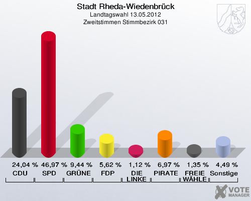 Stadt Rheda-Wiedenbrück, Landtagswahl 13.05.2012, Zweitstimmen Stimmbezirk 031: CDU: 24,04 %. SPD: 46,97 %. GRÜNE: 9,44 %. FDP: 5,62 %. DIE LINKE: 1,12 %. PIRATEN: 6,97 %. FREIE WÄHLER: 1,35 %. Sonstige: 4,49 %. http://www.votemanager.de
