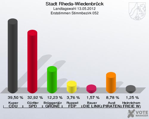 Stadt Rheda-Wiedenbrück, Landtagswahl 13.05.2012, Erststimmen Stimmbezirk 052: Kuper CDU: 39,50 %. Gürtler SPD: 32,92 %. Brüggenjürgen GRÜNE: 12,23 %. Ruppel FDP: 3,76 %. Bauer DIE LINKE: 1,57 %. Aust PIRATEN: 8,78 %. Heinrichsmeier FREIE WÄHLER: 1,25 %. http://www.votemanager.de
