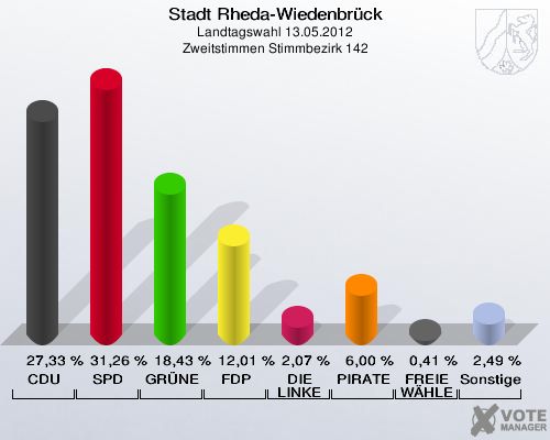 Stadt Rheda-Wiedenbrück, Landtagswahl 13.05.2012, Zweitstimmen Stimmbezirk 142: CDU: 27,33 %. SPD: 31,26 %. GRÜNE: 18,43 %. FDP: 12,01 %. DIE LINKE: 2,07 %. PIRATEN: 6,00 %. FREIE WÄHLER: 0,41 %. Sonstige: 2,49 %. http://www.votemanager.de