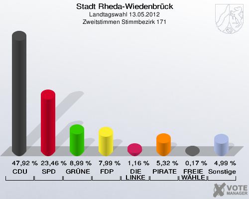 Stadt Rheda-Wiedenbrück, Landtagswahl 13.05.2012, Zweitstimmen Stimmbezirk 171: CDU: 47,92 %. SPD: 23,46 %. GRÜNE: 8,99 %. FDP: 7,99 %. DIE LINKE: 1,16 %. PIRATEN: 5,32 %. FREIE WÄHLER: 0,17 %. Sonstige: 4,99 %. http://www.votemanager.de