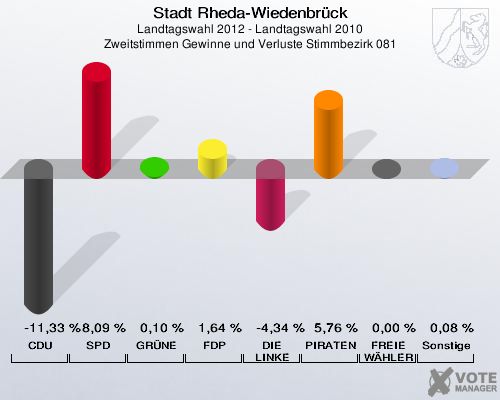 Stadt Rheda-Wiedenbrück, Landtagswahl 2012 - Landtagswahl 2010, Zweitstimmen Gewinne und Verluste Stimmbezirk 081: CDU: -11,33 %. SPD: 8,09 %. GRÜNE: 0,10 %. FDP: 1,64 %. DIE LINKE: -4,34 %. PIRATEN: 5,76 %. FREIE WÄHLER: 0,00 %. Sonstige: 0,08 %. http://www.votemanager.de