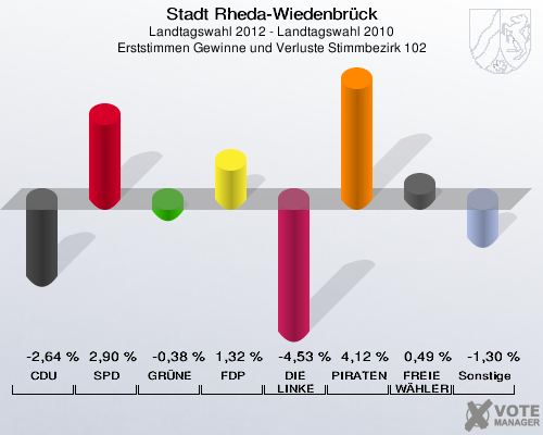 Stadt Rheda-Wiedenbrück, Landtagswahl 2012 - Landtagswahl 2010, Erststimmen Gewinne und Verluste Stimmbezirk 102: CDU: -2,64 %. SPD: 2,90 %. GRÜNE: -0,38 %. FDP: 1,32 %. DIE LINKE: -4,53 %. PIRATEN: 4,12 %. FREIE WÄHLER: 0,49 %. Sonstige: -1,30 %. http://www.votemanager.de