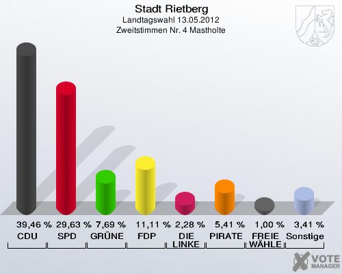 Stadt Rietberg, Landtagswahl 13.05.2012, Zweitstimmen Nr. 4 Mastholte: CDU: 39,46 %. SPD: 29,63 %. GRÜNE: 7,69 %. FDP: 11,11 %. DIE LINKE: 2,28 %. PIRATEN: 5,41 %. FREIE WÄHLER: 1,00 %. Sonstige: 3,41 %. http://www.votemanager.de