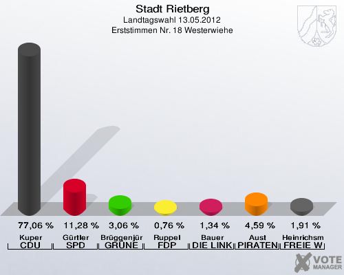 Stadt Rietberg, Landtagswahl 13.05.2012, Erststimmen Nr. 18 Westerwiehe: Kuper CDU: 77,06 %. Gürtler SPD: 11,28 %. Brüggenjürgen GRÜNE: 3,06 %. Ruppel FDP: 0,76 %. Bauer DIE LINKE: 1,34 %. Aust PIRATEN: 4,59 %. Heinrichsmeier FREIE WÄHLER: 1,91 %. http://www.votemanager.de