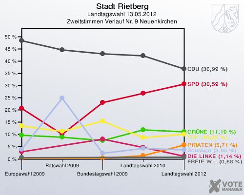 Stadt Rietberg, Landtagswahl 13.05.2012, Zweitstimmen Verlauf Nr. 9 Neuenkirchen: http://www.votemanager.de