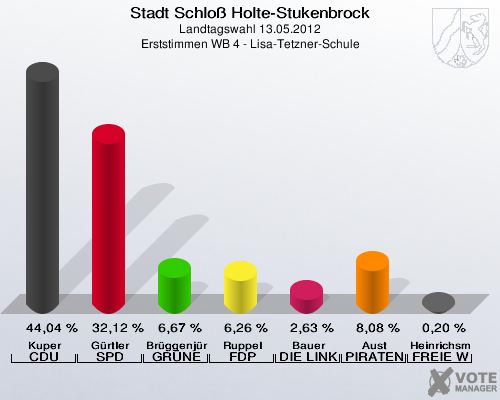 Stadt Schloß Holte-Stukenbrock, Landtagswahl 13.05.2012, Erststimmen WB 4 - Lisa-Tetzner-Schule: Kuper CDU: 44,04 %. Gürtler SPD: 32,12 %. Brüggenjürgen GRÜNE: 6,67 %. Ruppel FDP: 6,26 %. Bauer DIE LINKE: 2,63 %. Aust PIRATEN: 8,08 %. Heinrichsmeier FREIE WÄHLER: 0,20 %. http://www.votemanager.de