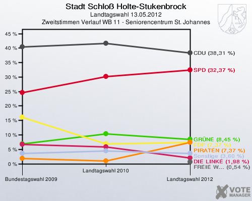 Stadt Schloß Holte-Stukenbrock, Landtagswahl 13.05.2012, Zweitstimmen Verlauf WB 11 - Seniorencentrum St. Johannes: http://www.votemanager.de