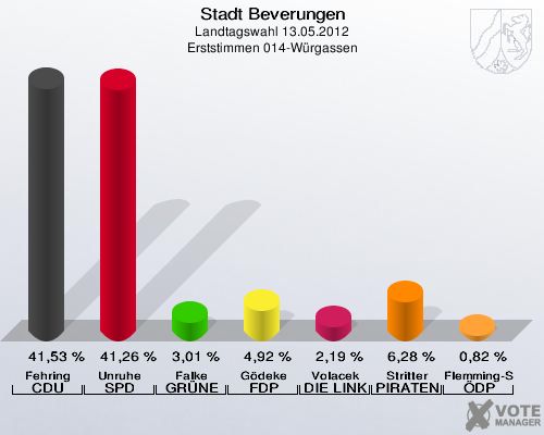 Stadt Beverungen, Landtagswahl 13.05.2012, Erststimmen 014-Würgassen: Fehring CDU: 41,53 %. Unruhe SPD: 41,26 %. Falke GRÜNE: 3,01 %. Gödeke FDP: 4,92 %. Volacek DIE LINKE: 2,19 %. Stritter PIRATEN: 6,28 %. Flemming-Schmidt ÖDP: 0,82 %. http://www.votemanager.de