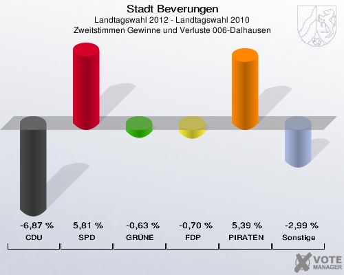 Stadt Beverungen, Landtagswahl 2012 - Landtagswahl 2010, Zweitstimmen Gewinne und Verluste 006-Dalhausen: CDU: -6,87 %. SPD: 5,81 %. GRÜNE: -0,63 %. FDP: -0,70 %. PIRATEN: 5,39 %. Sonstige: -2,99 %. http://www.votemanager.de