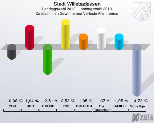 Stadt Willebadessen, Landtagswahl 2012 - Landtagswahl 2010, Zweitstimmen Gewinne und Verluste Altenheerse: CDU: -0,98 %. SPD: 1,94 %. GRÜNE: -2,51 %. FDP: 2,53 %. PIRATEN: 1,05 %. Die Tierschutzpartei: 1,67 %. FAMILIE: 1,05 %. Sonstige: -4,73 %. http://www.votemanager.de