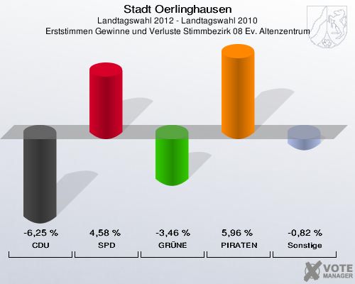 Stadt Oerlinghausen, Landtagswahl 2012 - Landtagswahl 2010, Erststimmen Gewinne und Verluste Stimmbezirk 08 Ev. Altenzentrum: CDU: -6,25 %. SPD: 4,58 %. GRÜNE: -3,46 %. PIRATEN: 5,96 %. Sonstige: -0,82 %. http://www.votemanager.de