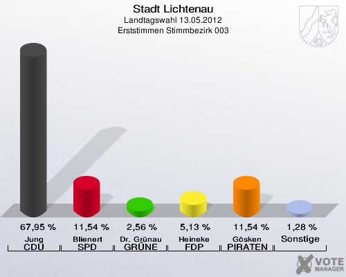 Stadt Lichtenau, Landtagswahl 13.05.2012, Erststimmen Stimmbezirk 003: Jung CDU: 67,95 %. Blienert SPD: 11,54 %. Dr. Grünau GRÜNE: 2,56 %. Heineke FDP: 5,13 %. Gösken PIRATEN: 11,54 %. Sonstige: 1,28 %. http://www.votemanager.de
