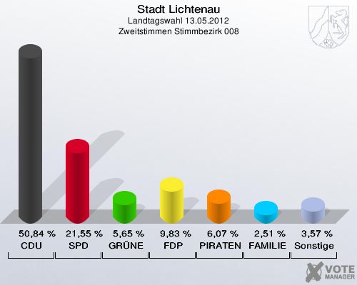 Stadt Lichtenau, Landtagswahl 13.05.2012, Zweitstimmen Stimmbezirk 008: CDU: 50,84 %. SPD: 21,55 %. GRÜNE: 5,65 %. FDP: 9,83 %. PIRATEN: 6,07 %. FAMILIE: 2,51 %. Sonstige: 3,57 %. http://www.votemanager.de