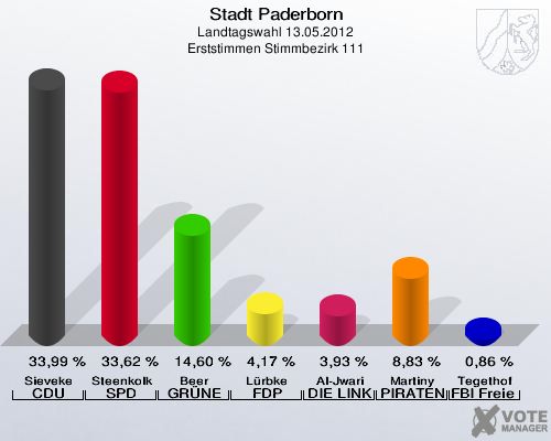 Stadt Paderborn, Landtagswahl 13.05.2012, Erststimmen Stimmbezirk 111: Sieveke CDU: 33,99 %. Steenkolk SPD: 33,62 %. Beer GRÜNE: 14,60 %. Lürbke FDP: 4,17 %. Al-Jwari DIE LINKE: 3,93 %. Martiny PIRATEN: 8,83 %. Tegethof FBI Freie Wähler: 0,86 %. http://www.votemanager.de