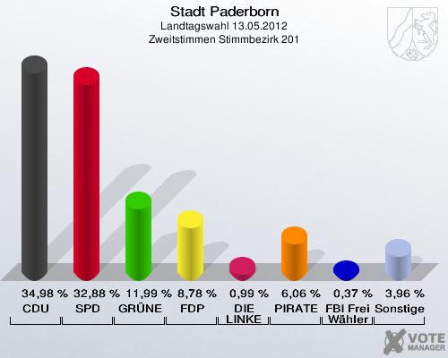 Stadt Paderborn, Landtagswahl 13.05.2012, Zweitstimmen Stimmbezirk 201: CDU: 34,98 %. SPD: 32,88 %. GRÜNE: 11,99 %. FDP: 8,78 %. DIE LINKE: 0,99 %. PIRATEN: 6,06 %. FBI Freie Wähler: 0,37 %. Sonstige: 3,96 %. http://www.votemanager.de