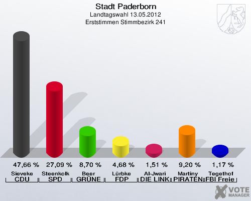 Stadt Paderborn, Landtagswahl 13.05.2012, Erststimmen Stimmbezirk 241: Sieveke CDU: 47,66 %. Steenkolk SPD: 27,09 %. Beer GRÜNE: 8,70 %. Lürbke FDP: 4,68 %. Al-Jwari DIE LINKE: 1,51 %. Martiny PIRATEN: 9,20 %. Tegethof FBI Freie Wähler: 1,17 %. http://www.votemanager.de